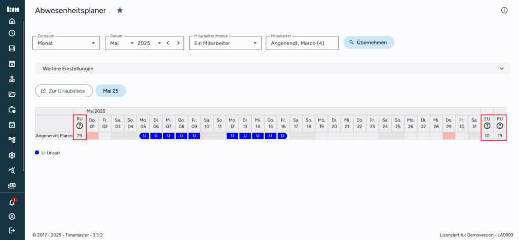 Im Abwesenheitsplaner stehen somit beim nächsten Aufruf für das Jahr 2025 ausschließlich 29,5 Tage zur Verfügung: