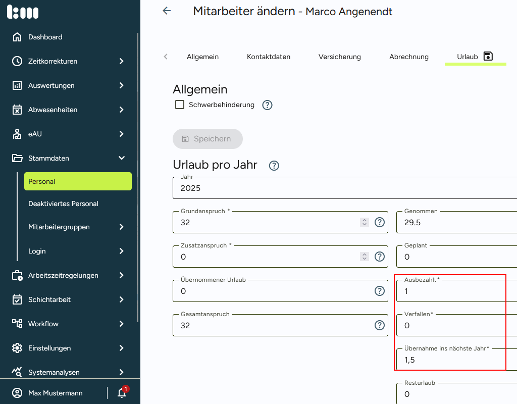 Wurden in dem Jahr nicht alle Tage vom Mitarbeiter genommen, so kann eine Übernahme, Auszahlung oder der Verfall des restlichen Urlaubsanspruchs erfolgen. Diese können Sie im Reiter “Urlaub” des jeweiligen Mitarbeiters im gewünschten Feld hinterlegen: