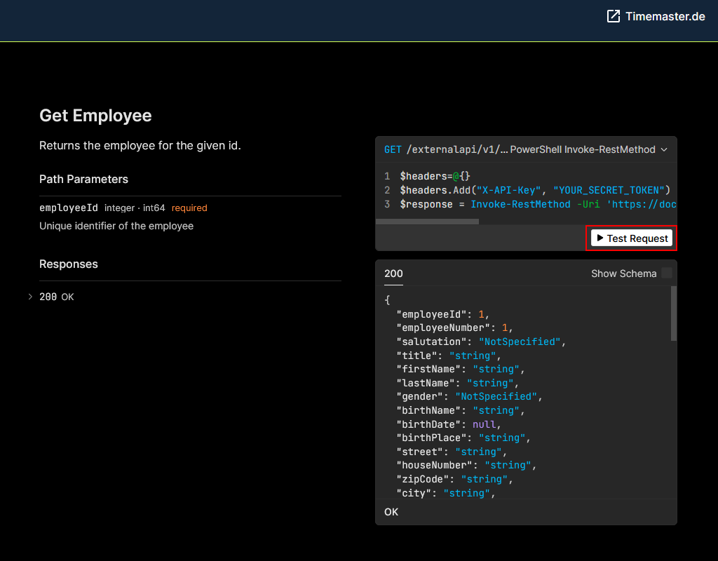 Mithilfe des API-Keys findet eine Verifizierung vor Durchführung der Datenabfrage statt. Abfragen mit einem gelöschten oder fehlerhaften Key werden vom System abgewiesen. Im folgenden Beispiel erfolgt eine Abfrage der Personaldaten via Powershell.