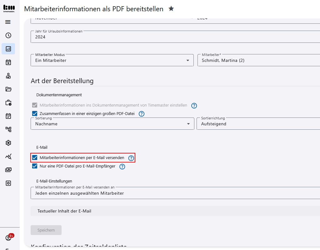 Als Erstes erfolgt die Auswahl des/der Mitarbeiter, für die eine Zeitsaldenliste erstellt werden soll. Der Parameter “Mitarbeiterinformationen per E-Mail versenden” wird angehakt, um den Mailversand auszuführen. Alternativ erfolgt das Erstellen von PDF-Dateien.