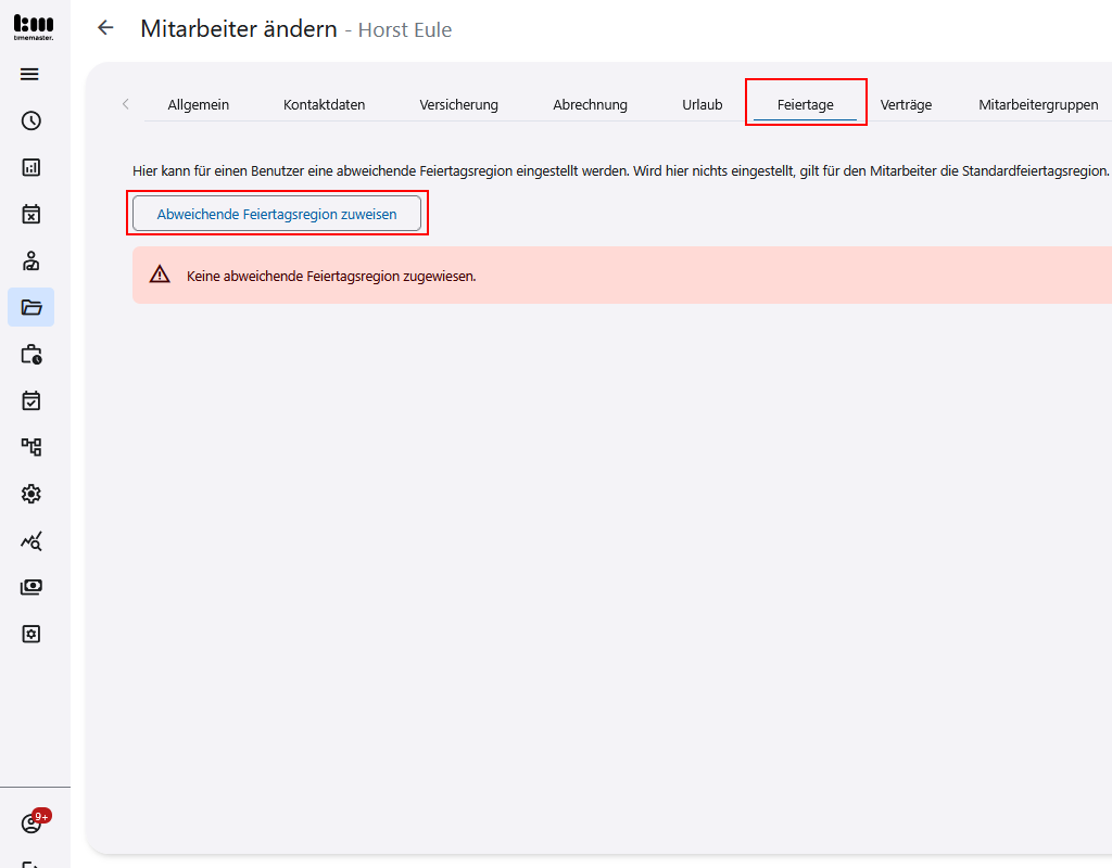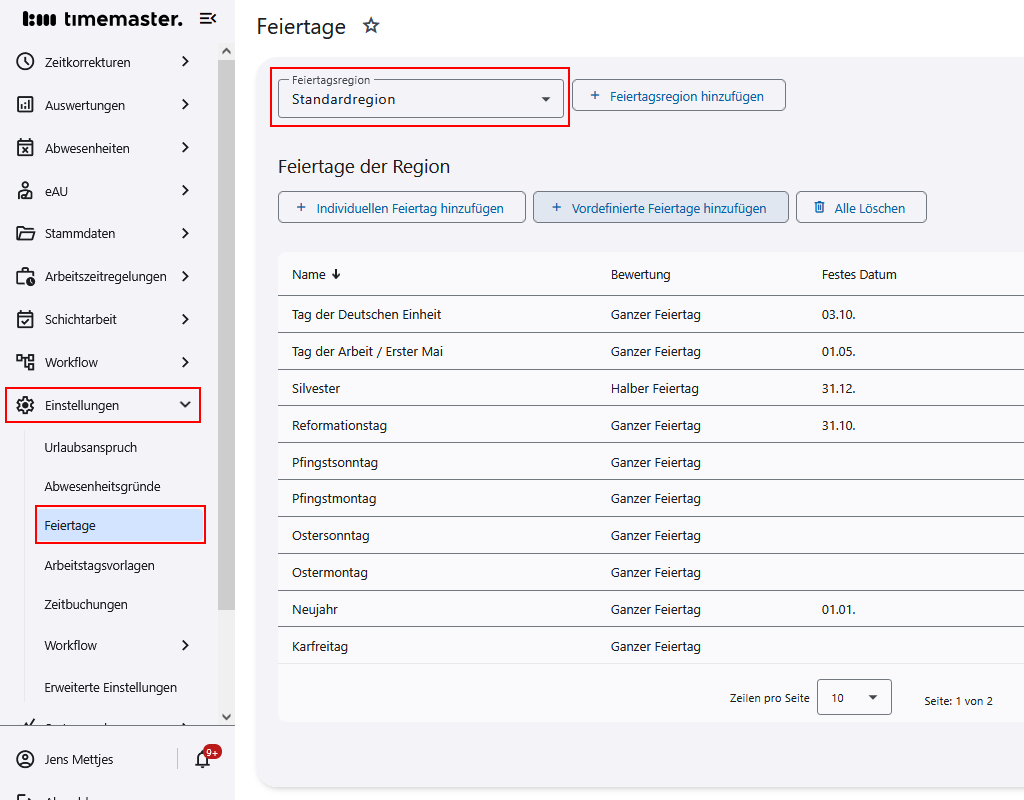 Im Reiter “Feiertage” kann die zuvor erstellte Feiertagsregion zugeordnet werden.