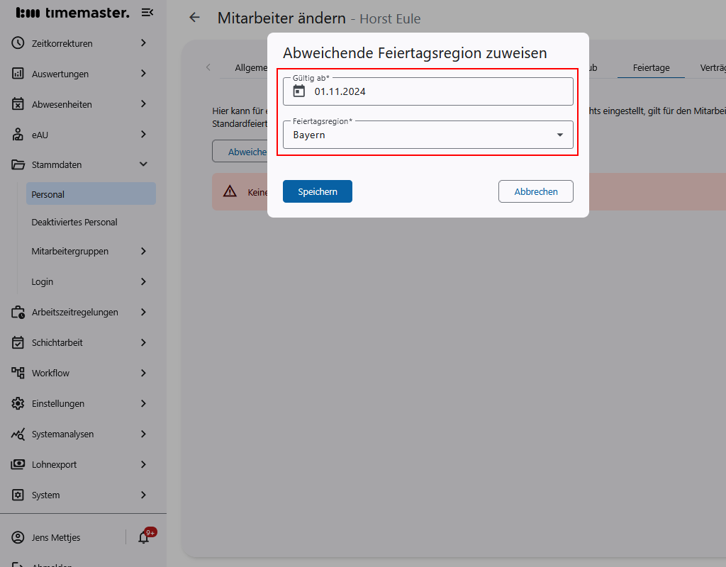 Nach einem Klick auf “Abweichende Feiertagsregion zuweisen” kann die Region im sich öffnenden Fenster hinterlegt werden. Neben Auswahl der Region ist auch die Eintragung eines Startdatums erforderlich.