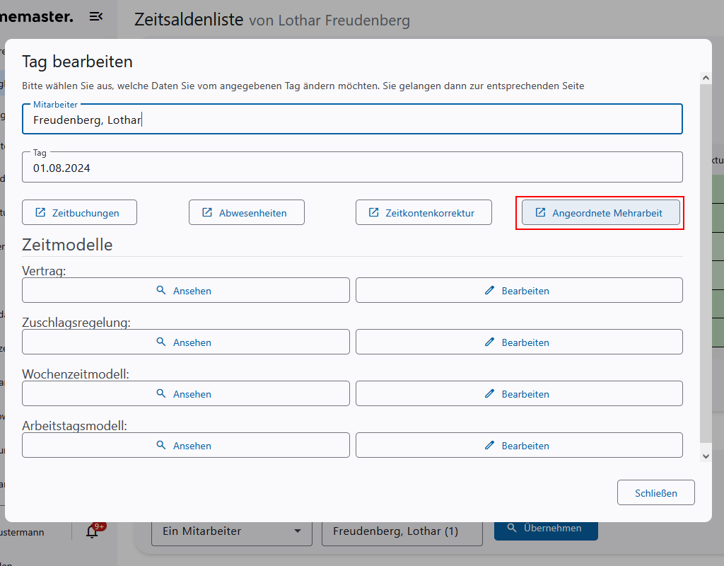 Nach Überprüfung war die zusätzlich geleistete Arbeit durch den Mitarbeiter aufgrund einer Messevorbereitung erforderlich. Um die gesamte Tagessumme zu bewerten, muss für den Mitarbeiter am 01.08. eine angeordnete Mehrarbeit eingetragen werden. Dies erfolgt mit Klick auf “Öffne Zeitsaldenliste” und am 01.08.2024 auf das Stiftsymbol.